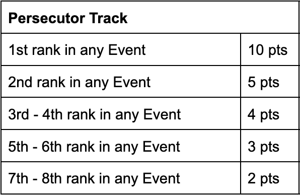 Series Points are cumulative. Throughout the series, we’ll maintain a standings board that shows your rank on the Persecutor track, your rank on the Pathfinder track, and your overall rank (determined by adding up all the points you’ve earned).